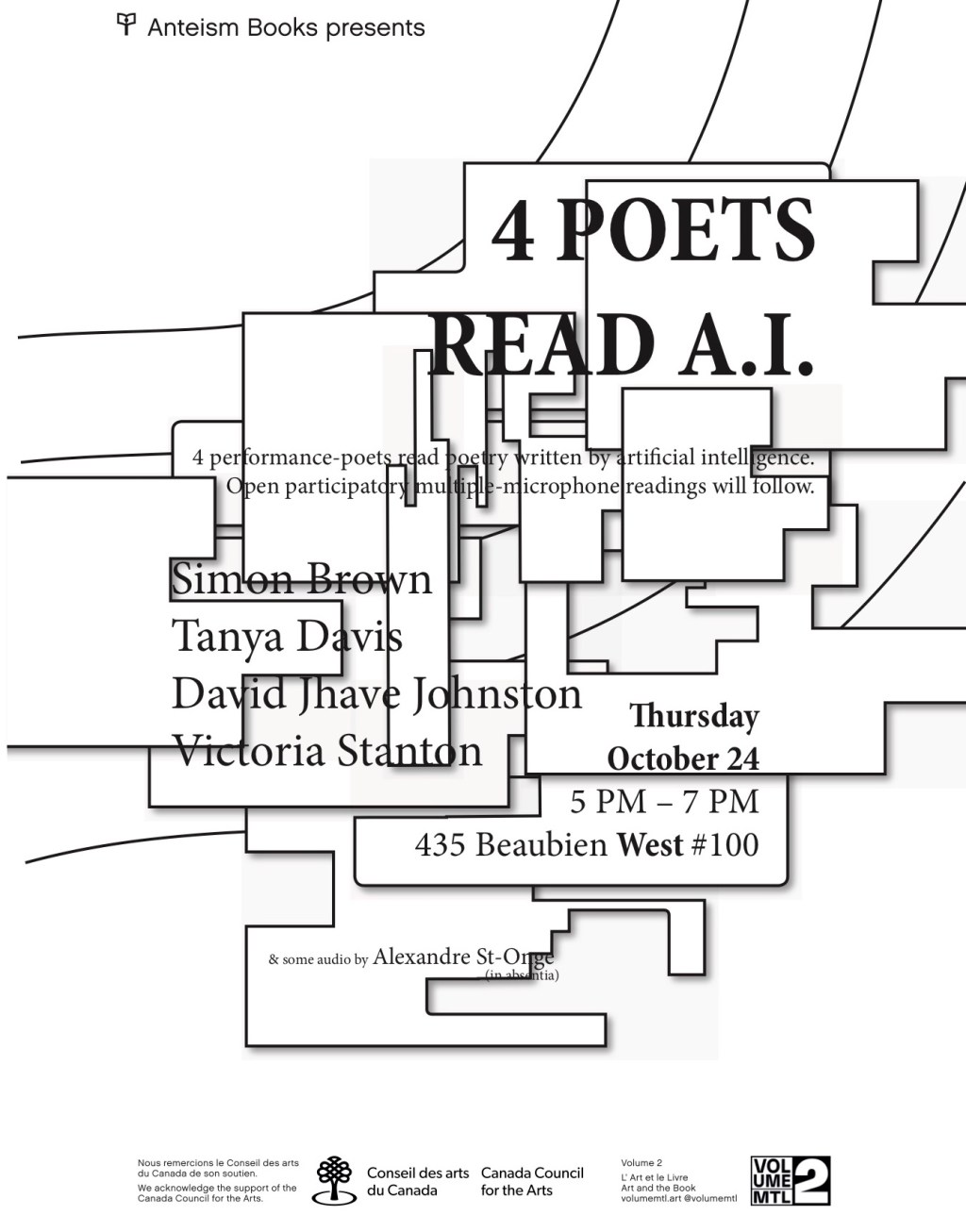 Maverick philosopher and digital poet, David Jhave Johnston celebrates the release of his epic multi-volume publication, ReRites (and its interactive installation counterpart) with an evening of spontaneous performative readings. Taking instances of projected A.I. generated poetry, invited artists (and audience) perform/present/interpret rapid-fire lines appearing & disappearing on the screen in real time.