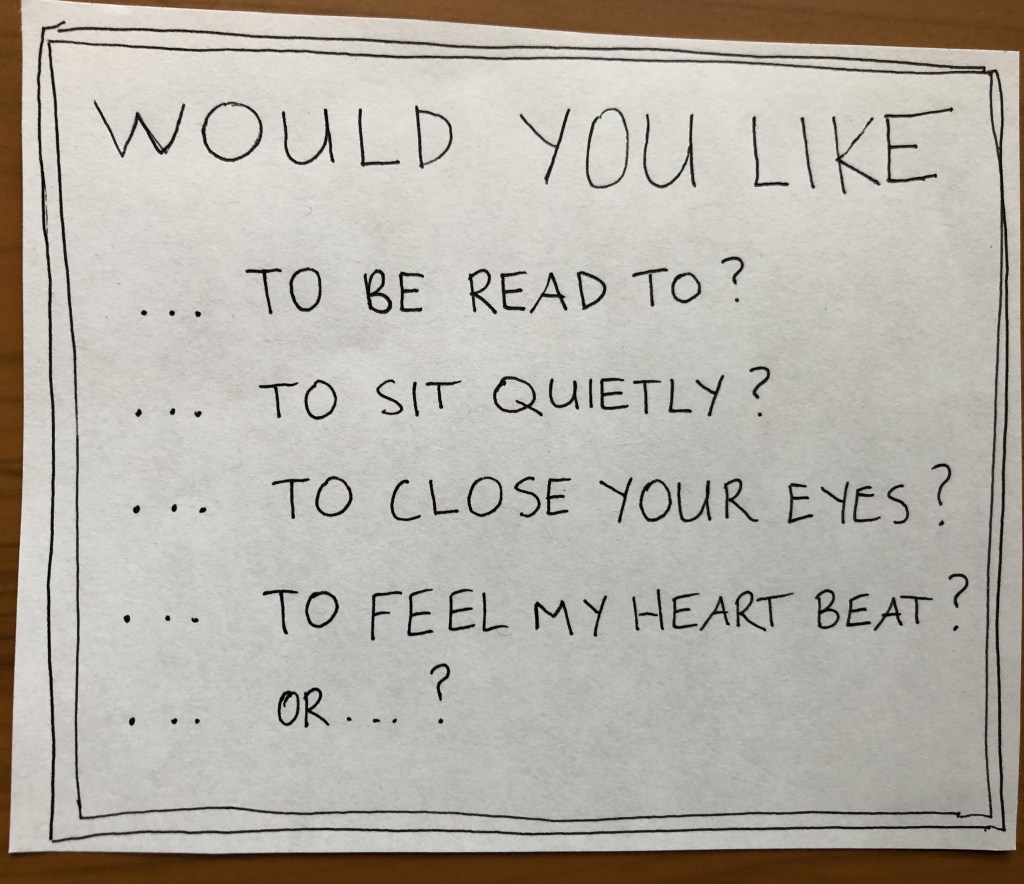 In a small tent inside a gallery, I experimented for the first time with “intimate” one-on-one encounters. Not wanting to dictate the unfolding, but offering a loose structure nonetheless, each person I sat with was invited to choose a topic from a limited selection as a starting point toward a shared encounter into the “unknown.”