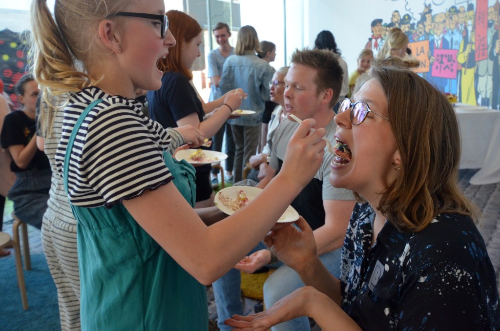 In a revival of my cake-feeding performance at the invitation of liveart.dk, I asked the young ones how they feel about food (and eating). Our conversation gave them the floor — but happened while they spoon-fed their parents, grandparents or a total (adult) stranger decadent mouthfuls of marzipan enveloped vanilla-raspberry cake.